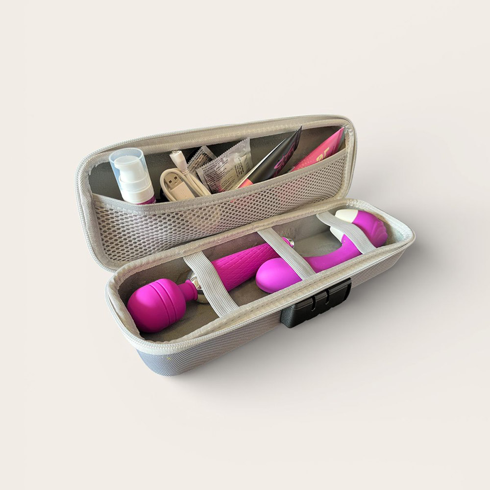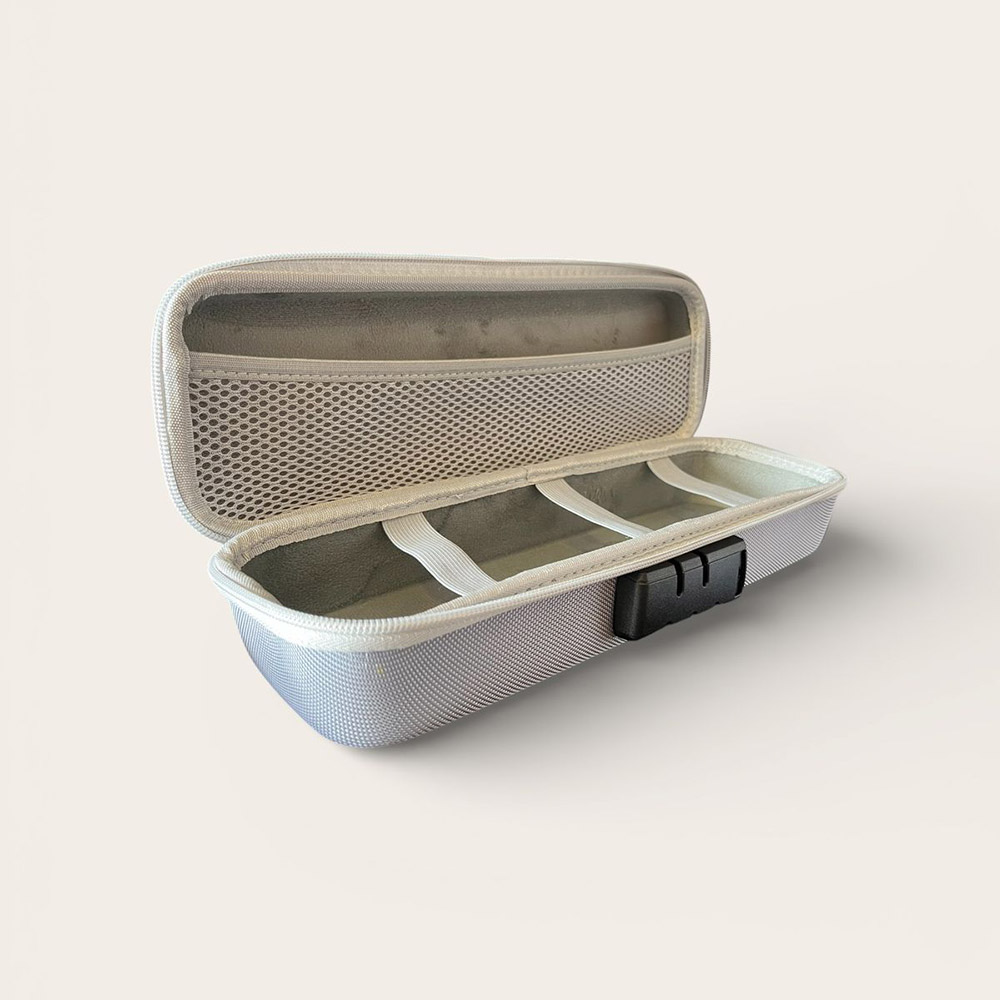Essa case une um design futurista com a máxima discrição. Sua cor prata perolada faz dele um acessório sofisticado, ideal para quem busca uma solução de armazenamento que não pareça, de forma alguma, um estojo de itens íntimos. Possui um robusto sistema de trava por combinação numérica acoplado à lateral, garantindo que o zíper permaneça travado e o conteúdo totalmente inacessível a terceiros.